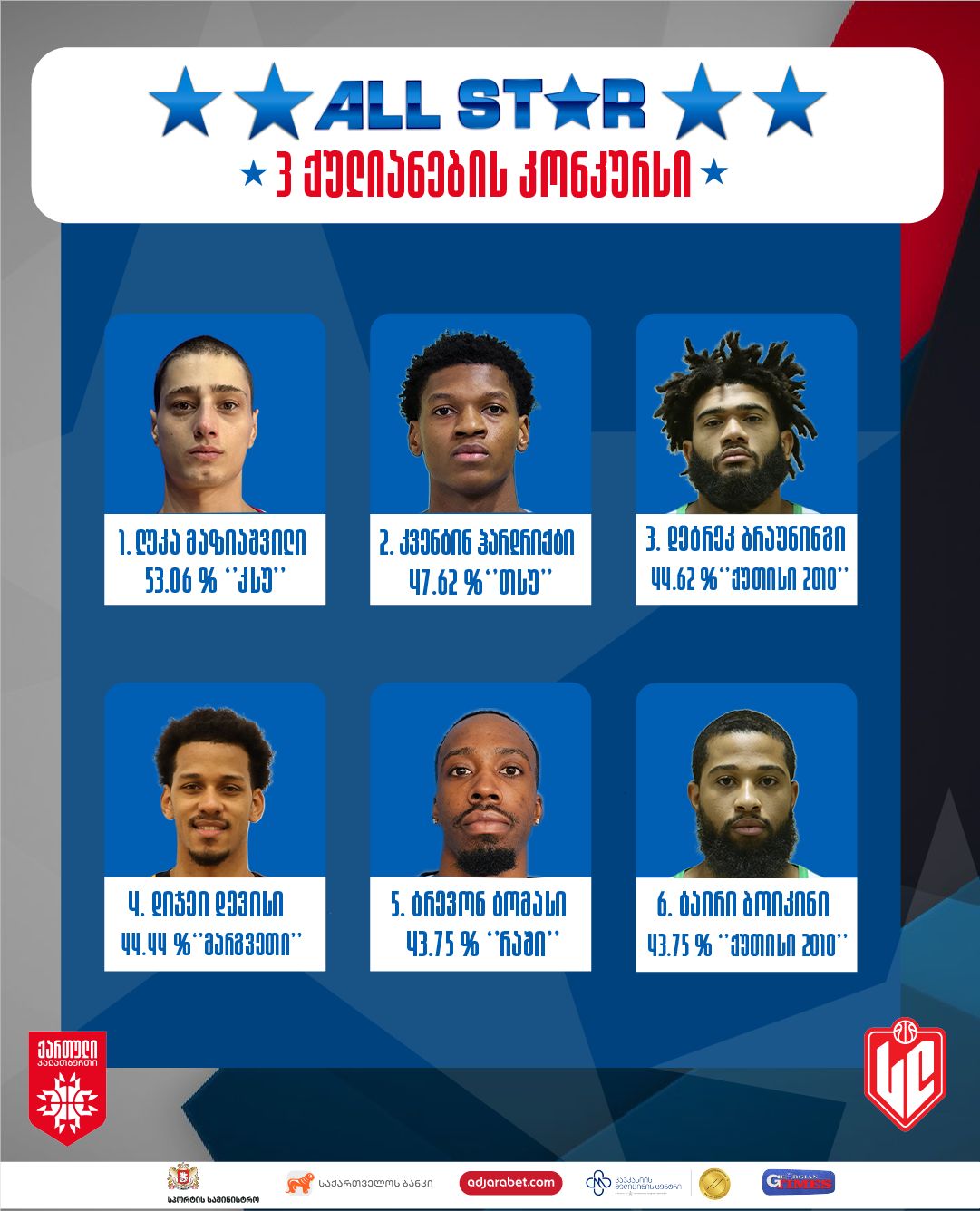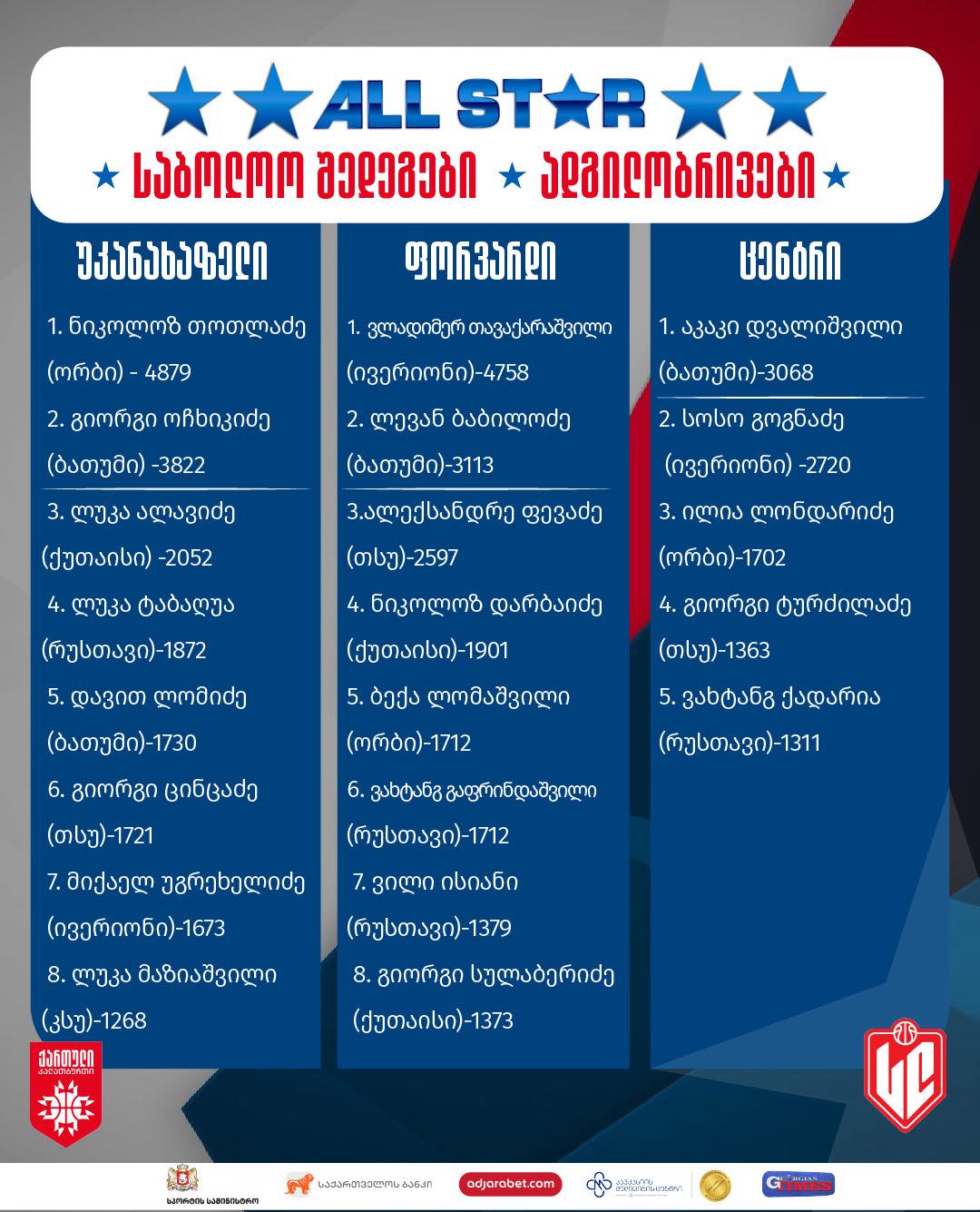 დასრულდა სუპერლიგის ყველა ვარსკვლავის მატჩისთვის ხუთეულის წევრთა შერჩევა, რისთვისაც 16 იანვრიდან სუპერლიგის ვებ-გვერდზე გამოკითხვა მიმდინარეობდა. გულშემატკივრებს დღეში ერთხელ შეეძლოთ საკუთარი შეხედულებისამებრ მატჩის მონაწილე გუნდების ხუთეულები, ჯამში 10 კალათბურთელი დაესახელებინათ. ერთკვირიანი გამოკითხვის შედეგად ოლ სტარში მეტოქე გუნდების ხუთეულის წევრები შეირჩა: