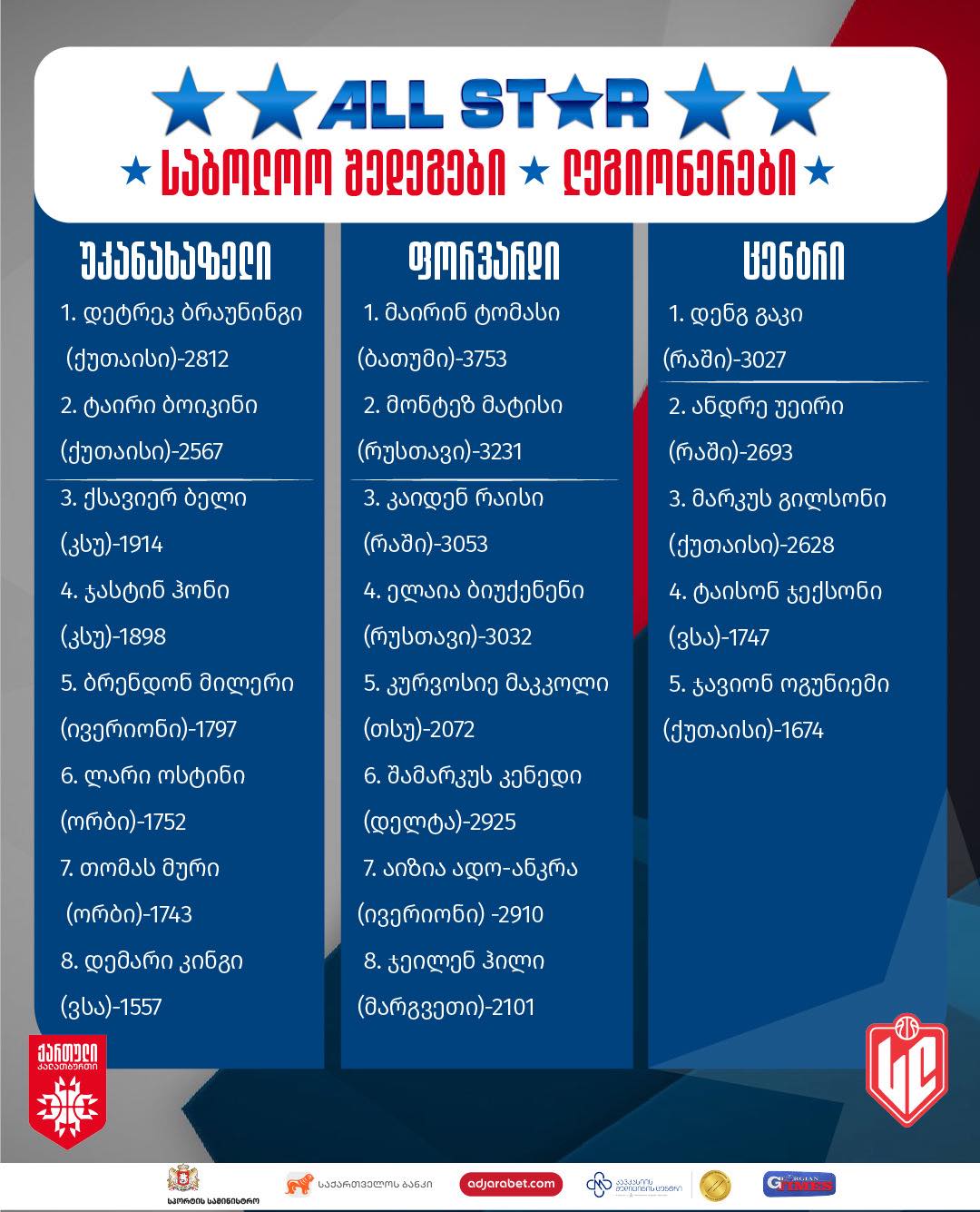ლეგიონერები: დეტრეკ ბრაუნინგი (ქუთაისი), ტაირი ბოიკინი (ქუთაისი), მონტეს მატისი (რუსთავი), მაირინ ტომასი (ბათუმი), დენგ გაკი (რაში).