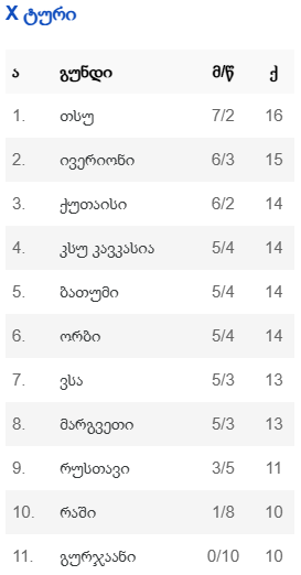 სატურნირო ცხრილში ივერიონი მე-2 ადგილზე აღზევდა, თუმცა ცხრილში ისეთი სიმჭიდროვეა, პირველ და მე-8 ადგილებზე მყოფ გუნდებს შორის მხოლოდ 3 ქულაა სხვაობა. მე-10 ტურის დარჩენილი 2 მატჩი 21 დეკემბერს რუსთავსა (მარგვეთი) და ქუთაისში (ვსა) გაიმართება.