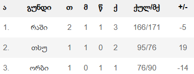 რაშმა პირველ მატჩში თსუ-სთან 19-ქულიანი მარცხის შემდეგ დღეს ორბს 14 ქულით მოუგო, თუმცა ჯგუფიდან გასვლის შანსი არ აქვს. მიზეზი ისაა, რომ 2 მატჩის ჯამში გამარჯვება და 5-ბურთიანი უარყოფითი ბალანსი აქვს. ამ შედეგით იგი უკვე ჩამორჩა რუსთავს და მეორე ადგილიდან ნახევარფინალში გასვლის შანსი დაკარგა.