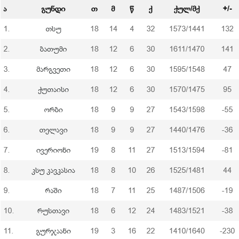 რაშმა ქულით გადაასწრო რუსთავს და იმასაც თუ გავითვალისწინებთ, რომ მეტოქეს ურთიერთშეხვედრებში ჯობნის, სუპერლიგაში დარჩენის კარგი შანსი აქვს. დარჩენილ 2 ტურში რუსთავმა ორივე მატჩი (ბათუმთან და ორბთან) უნდა მოიგოს, რაშმა კი ორივე (თსუ-სთან და ბათუმთან) წააგოს, მე-10, დამრჩენ ადგილზე რუსთავი რომ გავიდეს. სხვა ვარიანტში მე-10-ზე რაში გავა, ხოლო რუსთავს დასარჩენად “ა” ლიგის ფინალისთან საკვალიფიკაციო სერიაში დაპირისპირება მოუწევს, რომელიც 3 მოგებამდე გაგრძელდება.