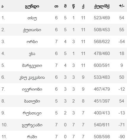თსუ-მ საბოლოოდ იოლად – 87:65 (სტატისტიკა) გაიმარჯვა და ცხრილის სათავეში “ქუთაისს” შეუერთდა. მათსავით 5 მოგება და 1 მარცხი აქვს ვსა-საც, მაგრამ ცხრილში მათ შორის 4 მოგება – 3 მარცხის მქონე ორბია.