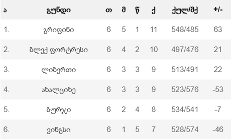 დასრულდა “ა” ლიგის მე-6 ტური და პირველად მოხდა, რომ ტურნირს ერთპიროვნული ლიდერი ჰყავს. კასპის გრიფინი 6 ტურის შემდეგ ერთადერთია, რომელმაც ყველაზე მეტი – 5 მოგება მოიპოვა და ამ შედეგით, ცხადია, პირველ ადგილზეა. კასპელებმა ტურის საკუთარი შეხვედრა გუშინ, საკუთარ ქალაქში, ლიბერთისთან მოიგეს. დღეს კი დიღომი არენაზე დანარჩენი 2 მატჩი შედგა, რომელთაგან ერთში გრიფინის კონკურენტი ბლექ ფორტრესი ბოლო ადგილზე მყოფ თელავის ბურჯს მასპინძლობდა.