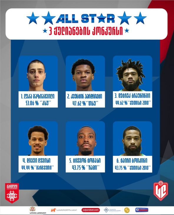 სნაიპერთა კონკურსში მონაწილეობას სუპერლიგაში 3-ქულიანი სროლების პროცენტული მაჩვენებლით ლიდერი ეს 6 მოთამაშე მიიღებს: