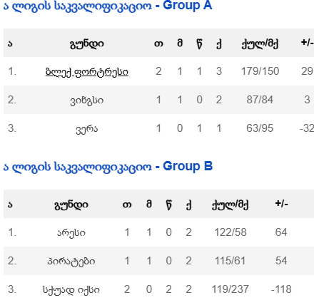 “ა” ლიგის საკვალიფიკაციო ტურნირში მე-2 ტურის მატჩები გაიმართა. თბილისი არენაზე გამართული 2 შეხვედრიდან ერთში დიდი ბრძოლა გაიმართა, მეორეში დაძაბულობა არ ყოფილა. “პირატებმა”115:61 გაანადგურეს “სქუად x”. ამ უკანასკნელმა საკვალიფიკაციო ტურნირში ასპარეზობა დაასრულა, რადგან ჯგუფის ორივე შეხვედრა წააგო და ბოლო ადგილზე გავიდა. B ჯგუფში პირველ-მეორე ადგილებს პირატები და არესი გაითამაშებენ. ეს გუნდები უკვე ნახევარფინალში არიან და ბოლო ტურში ერთმანეთს პირველი ადგილისთვის შეხვდებიან. აღსანიშნავია, რომ ორივე ნახევარფინალშია, რადგან ჯგუფიდან 2 საუკეთესო გადის.